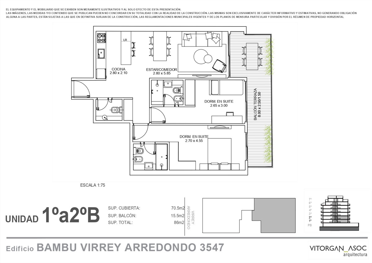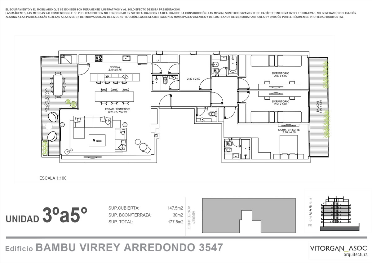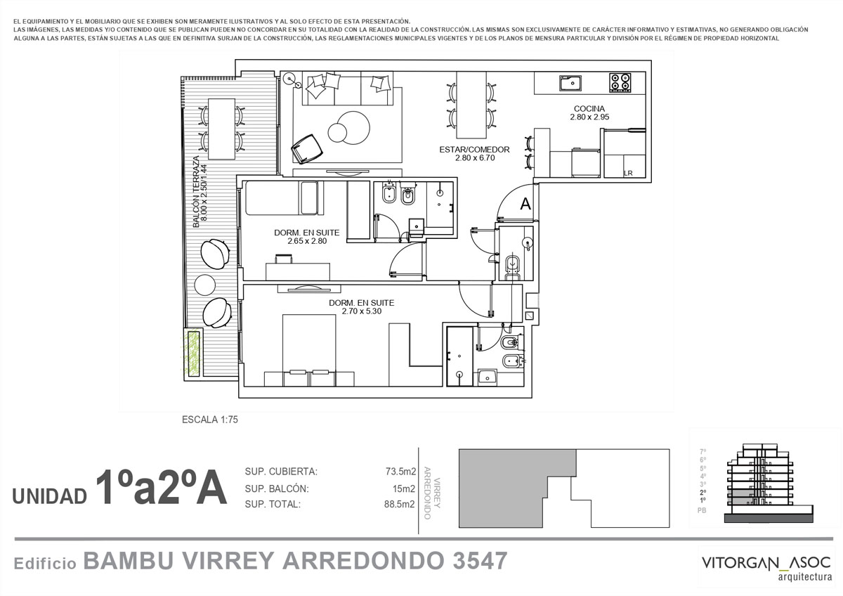 En las primeras dos plantas se distribuyen 4 semipisos de 3 ambientes con expansiones propias; en las cinco plantas siguientes se encuentran 5 pisos de 3 y 4 ambientes.