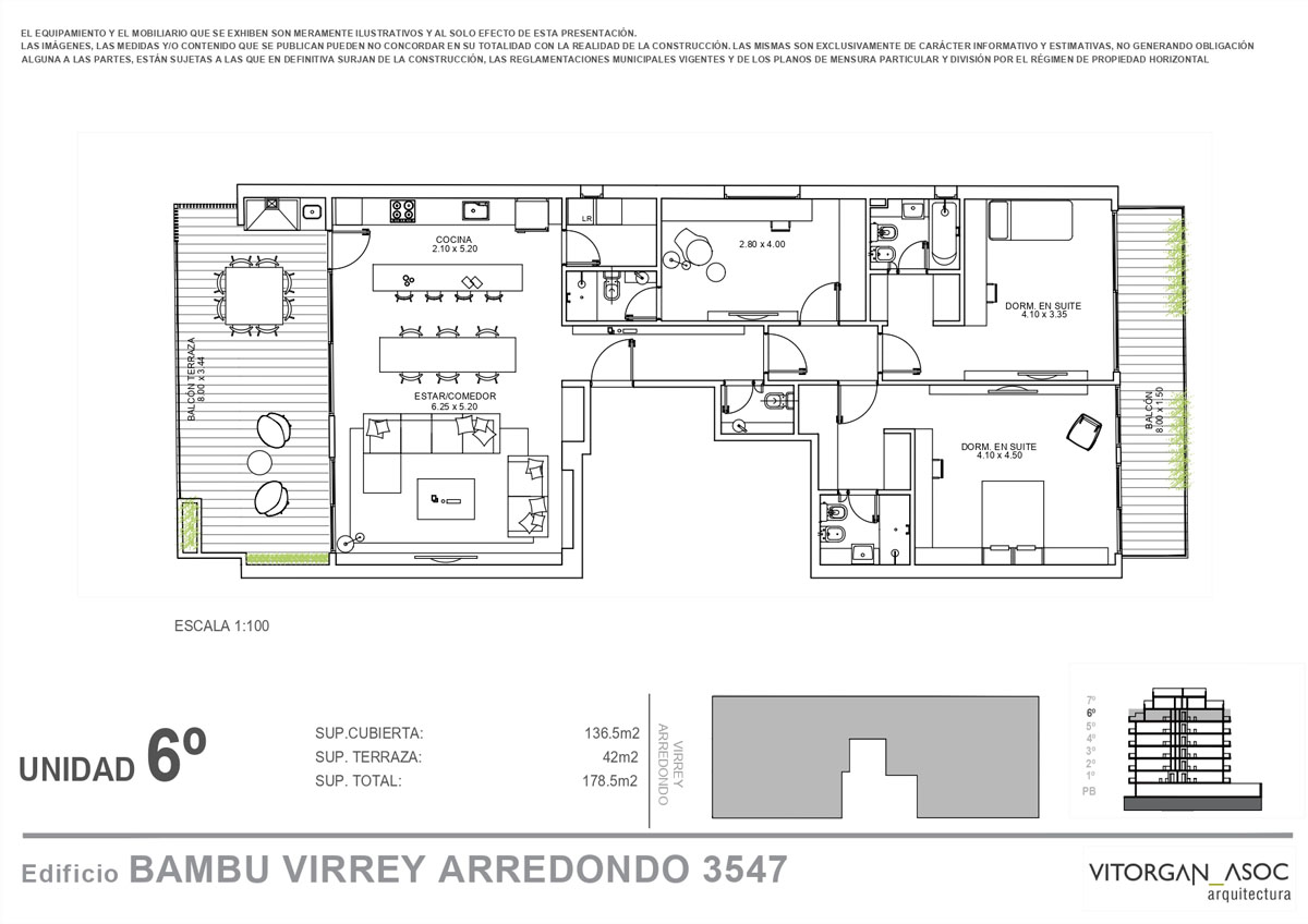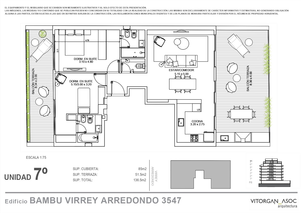 En las primeras dos plantas se distribuyen 4 semipisos de 3 ambientes con expansiones propias; en las cinco plantas siguientes se encuentran 5 pisos de 3 y 4 ambientes.